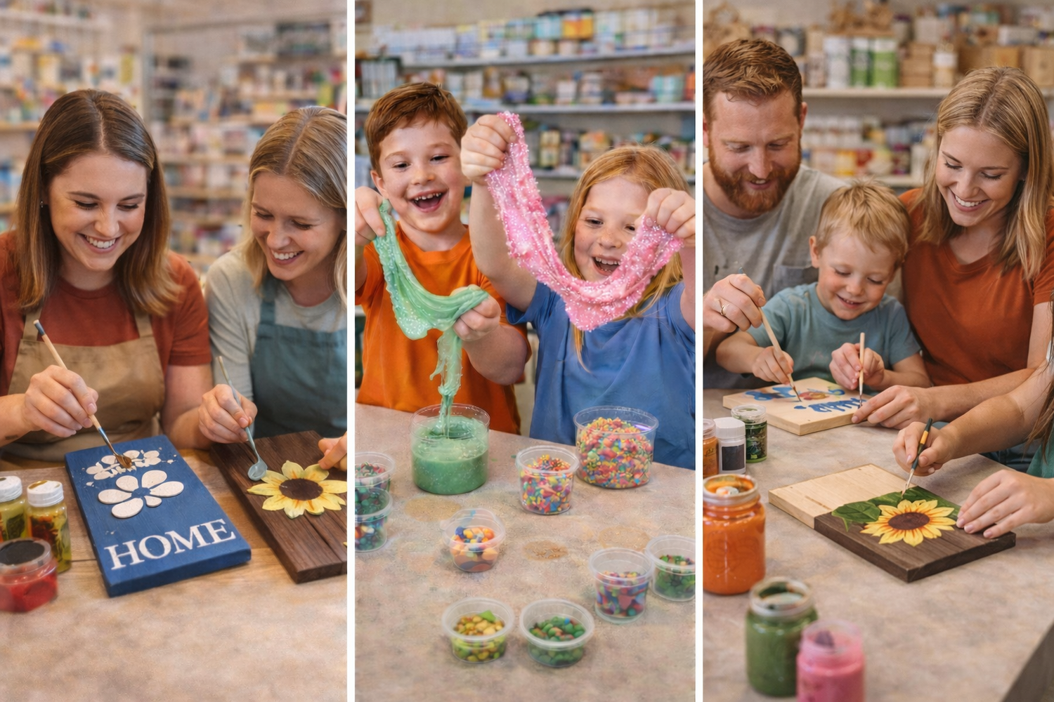 Our studio experience goes beyond traditional crafting. Paint a personalized DIY project, build custom slime at our slime bar, or participate in a guided workshop. We've created a space that feels polished, welcoming, and inspiring for all ages.