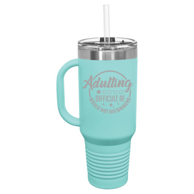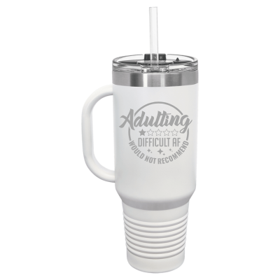 40 oz "Adulting Difficult AF Would Not Recommend" travel mug. Funny insulated stainless steel tumbler with handle and straw. Personalized gift in 8 colors.