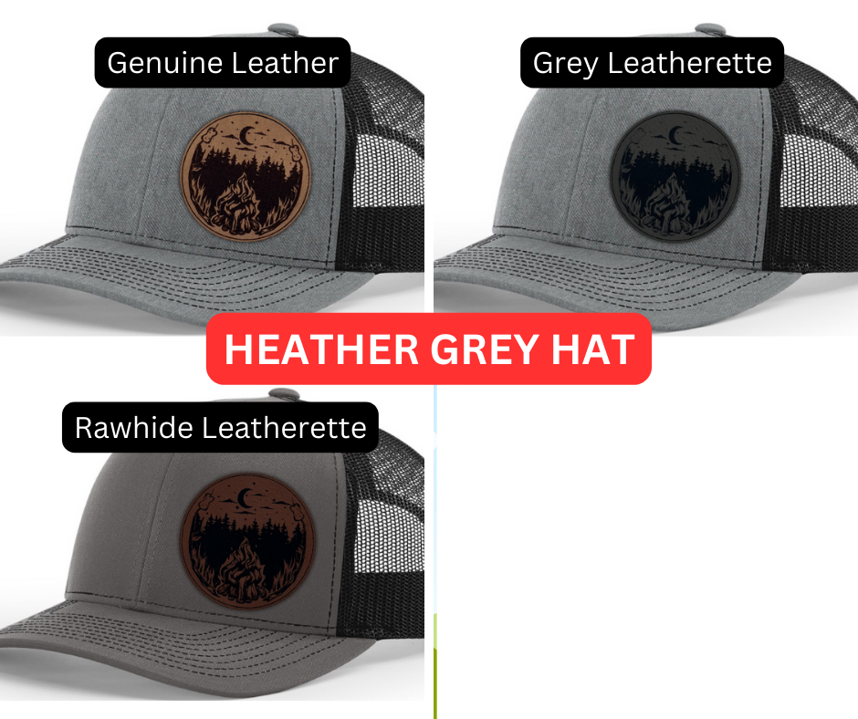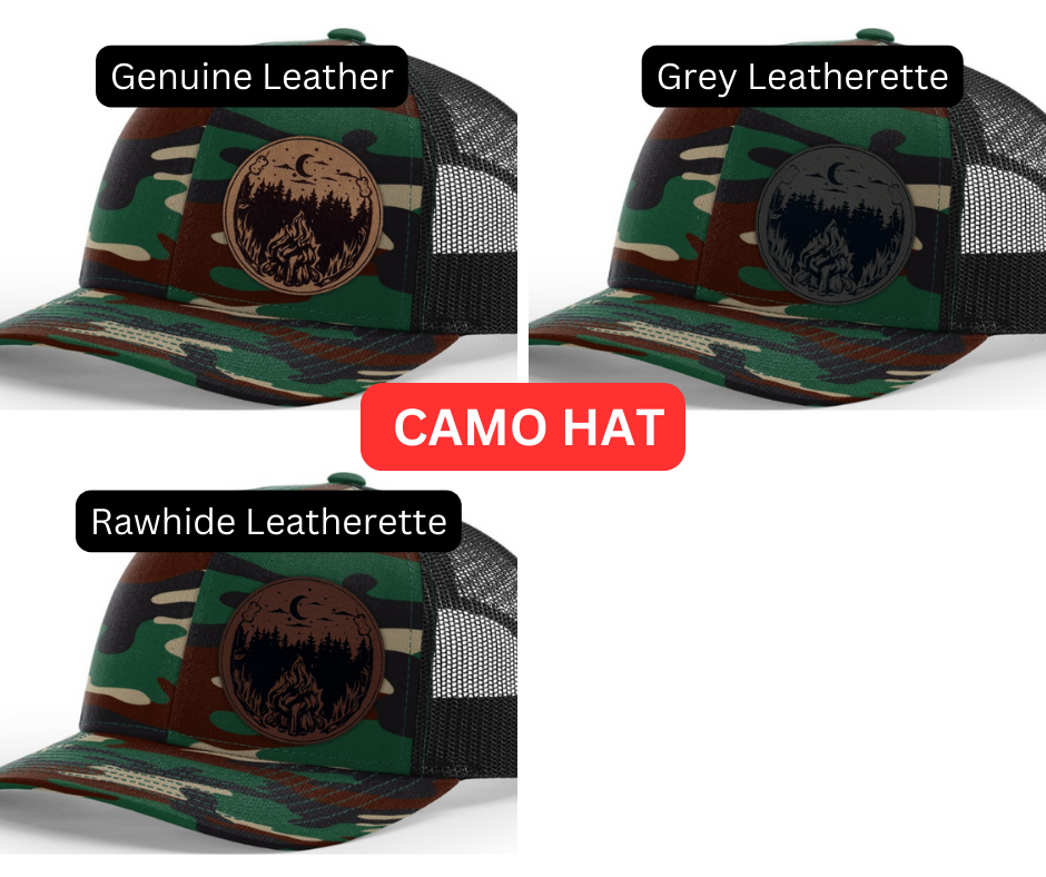 Crafted with precision and comfort in mind, the Richardson 112 Snapback offers an adjustable fit, while the FlexFit L/XL provides a snug and flexible feel. The defining feature of this hat is its meticulously crafted patch, available in Genuine Leather, Rawhide Leatherette, and Grey Leatherette. This emblem features a serene campfire scene against a backdrop of twinkling stars, inviting wearers to immerse themselves in the tranquility of the great outdoors.