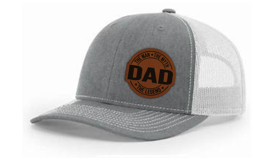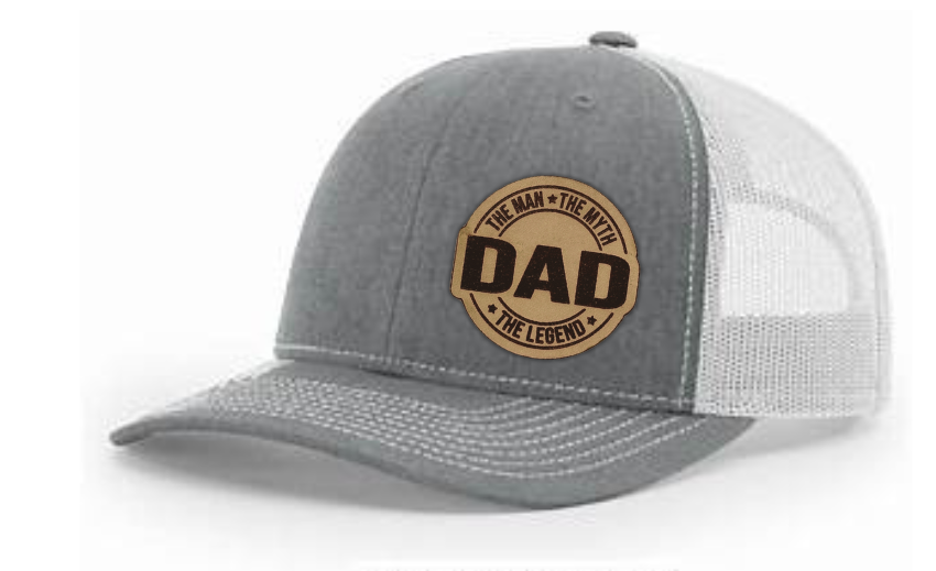 Honor the legendary dads in your life with this stylish Richardson 112 or FleFit L/Xl hat, featuring a laser-engraved leather patch that proudly states: "DAD The Man, The Myth, The Legend"