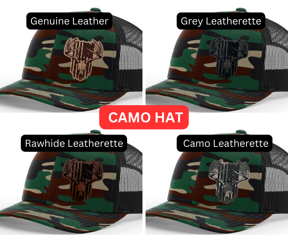 The heart of this hat lies in its meticulously crafted patch, available in Genuine Leather, Rawhide Leatherette, Grey Leatherette, and Camo Leatherette. The combination of the American flag and the deer skull symbolizes the harmony between nature and patriotism, making it an ideal accessory for outdoor enthusiasts and proud Americans alike.