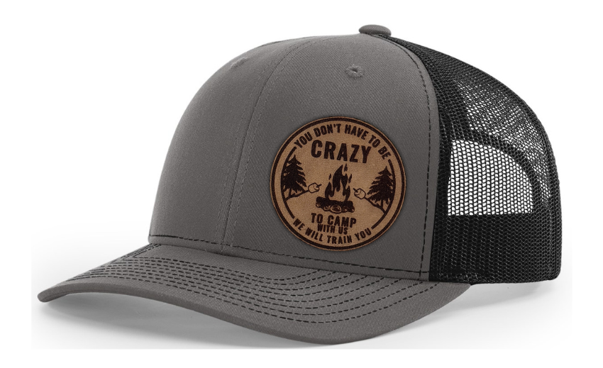 Crafted with precision and comfort in mind, the Richardson 112 Snapback offers an adjustable fit, while the FlexFit L/XL provides a snug and flexible feel. The defining feature of this hat is its meticulously crafted patch, available in Genuine Leather, Rawhide Leatherette, and Grey Leatherette. This emblem humorously invites newcomers to the camping world, promising to provide the necessary training amidst the wilderness.