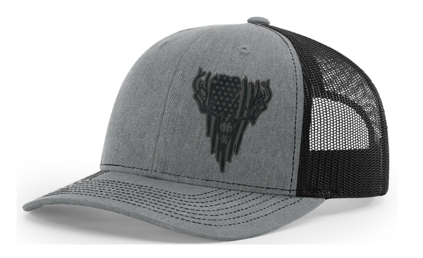 Crafted with precision and comfort in mind, the Richardson 112 Snapback offers an adjustable fit, while the FlexFit L/XL provides a snug and flexible feel. The defining feature of this hat is its meticulously crafted patch, presenting the fusion of the American flag with an elk skull. Available in Genuine Leather, Rawhide Leatherette, Grey Leatherette, and Camo Leatherette, the emblem captures the spirit of freedom, the majesty of wildlife, and the enduring beauty found in the great outdoors.