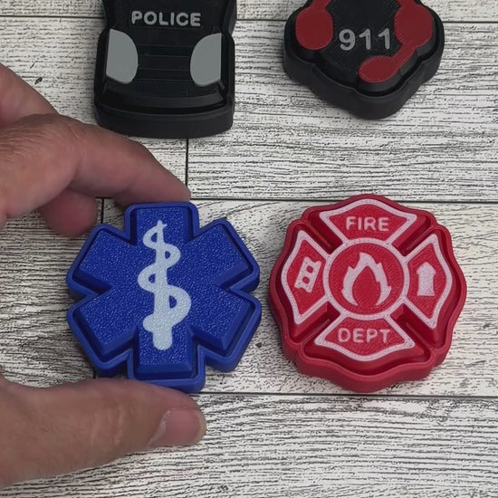 Four Iconic Designs - Fire Dept Maltese Cross, Police Vest, EMS Star of Life, and 911 Dispatcher Headset