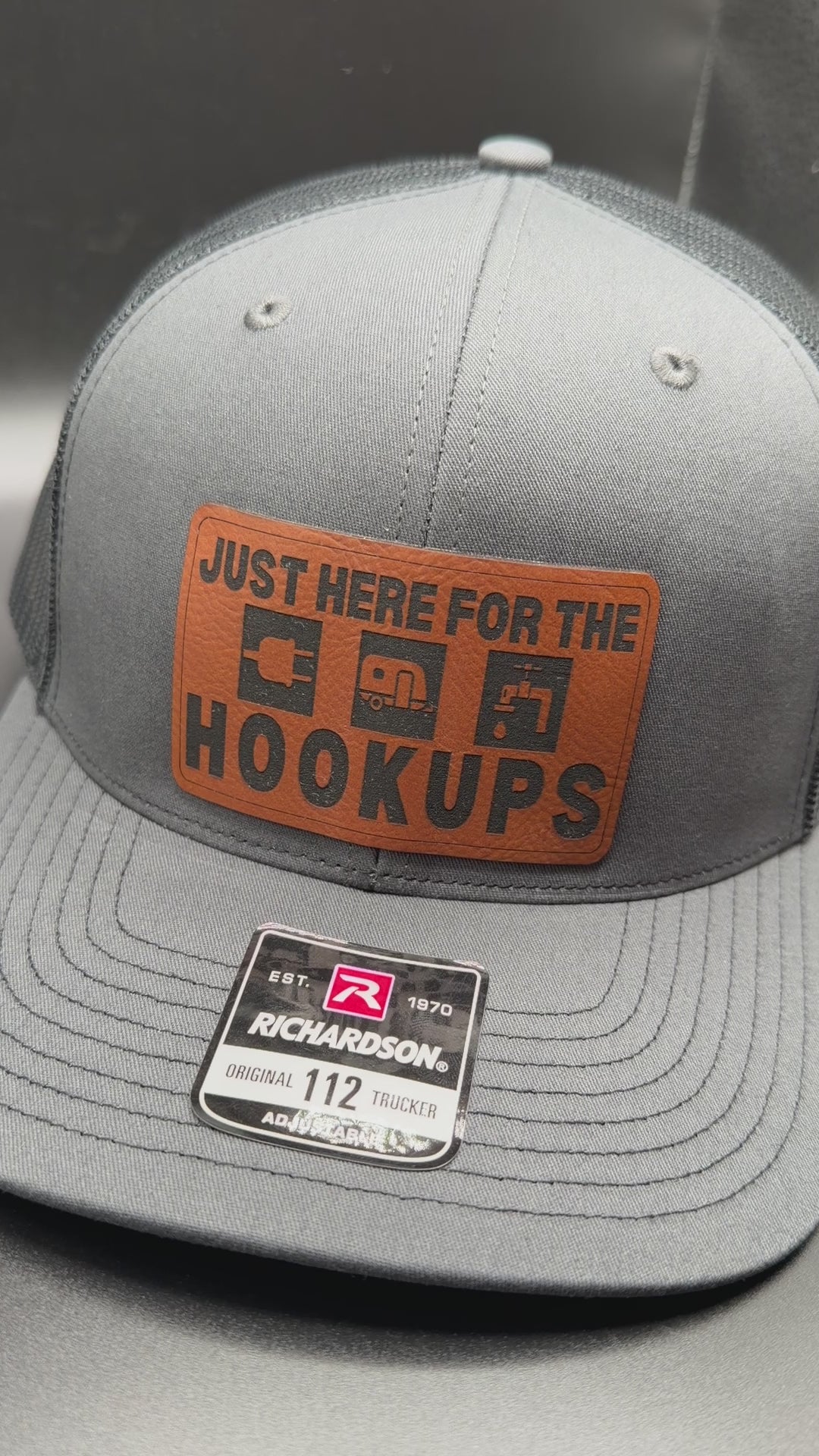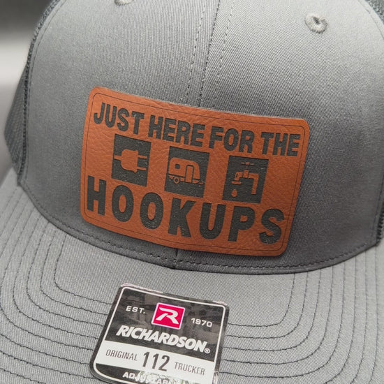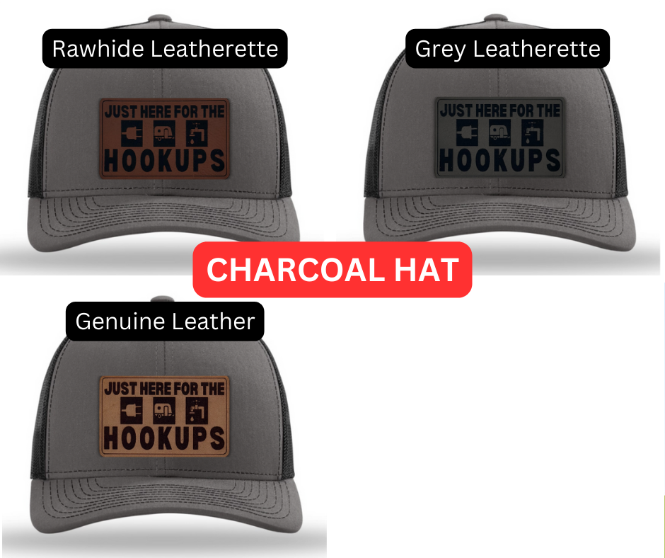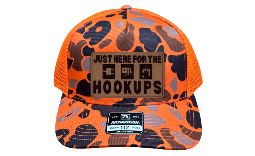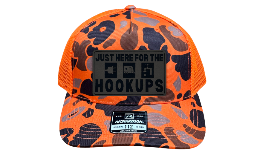 Crafted with precision and comfort in mind, the Richardson 112 Snapback offers an adjustable fit, while the FlexFit L/XL provides a snug and flexible feel. The defining feature of this hat is its meticulously crafted 'Just Here for the Hookups' patch, available in Genuine Leather, Rawhide Leatherette, and Grey Leatherette. This emblem features an image of a water spicket, camper, and electric plug, symbolizing the simple pleasures of outdoor living and the shared experiences of camping enthusiasts.