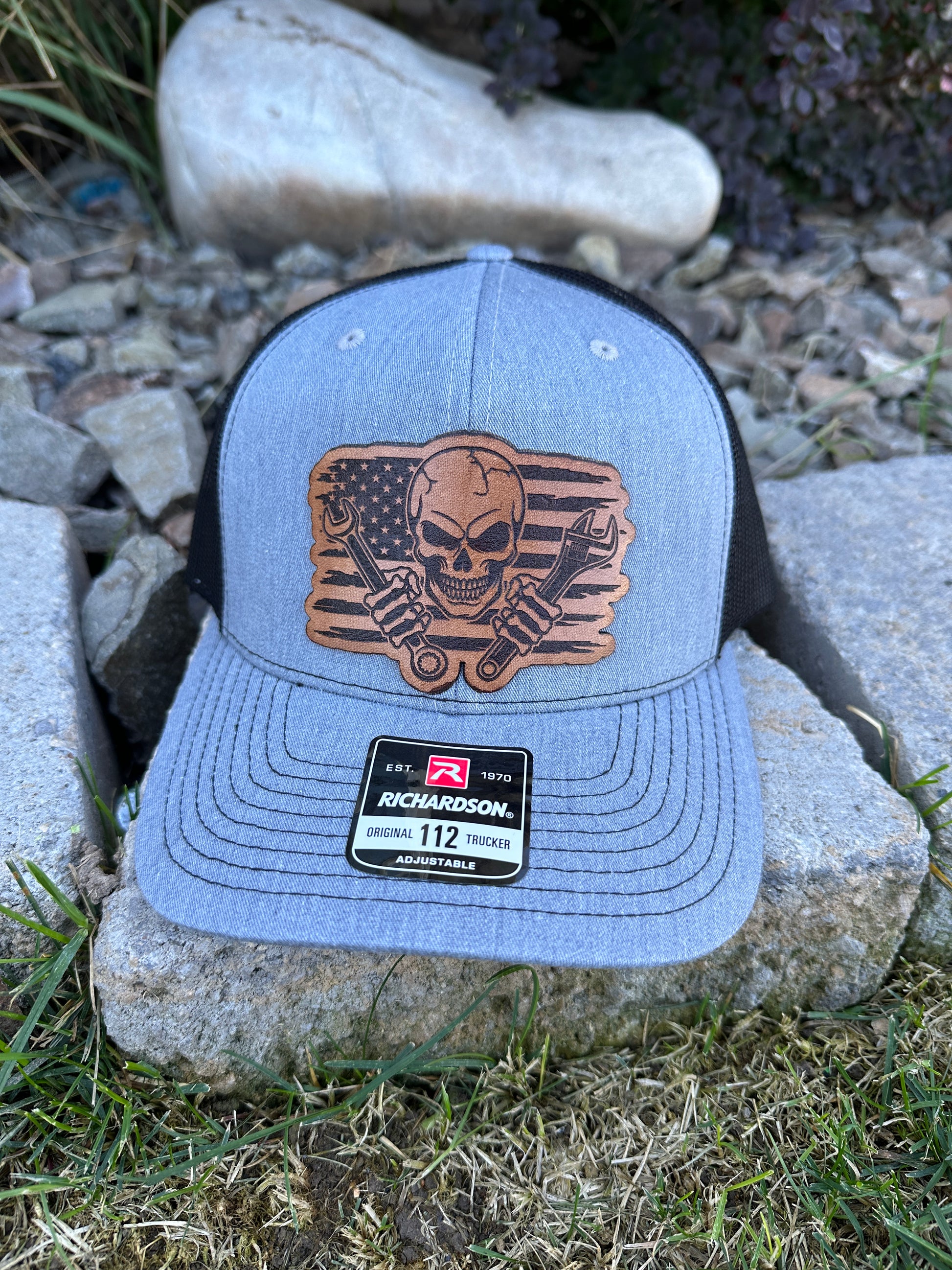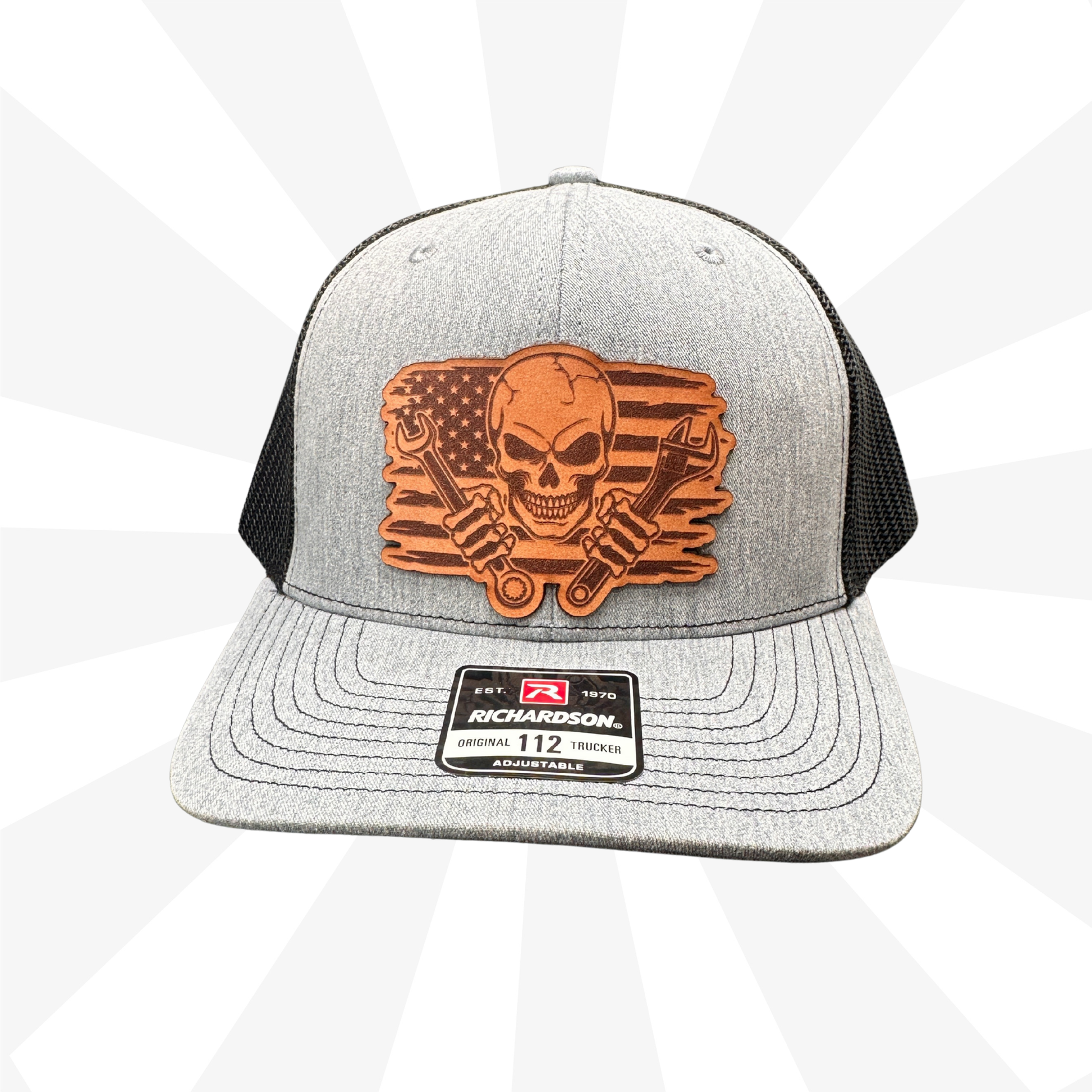 This Skull and Wrench Richardson 112 Trucker Hat is built for those who live life in the garage, on the job site, or out on the open road. Featuring a premium engraved leather patch with a rugged skull-and-wrench design over a distressed American flag, this hat blends attitude with craftsmanship.