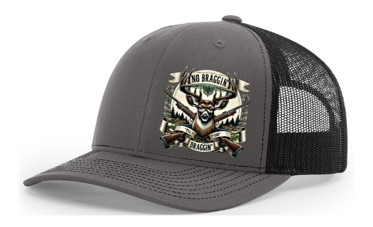 Show off your hunting pride with the Richardson 112 snapback or FlexFit L/XL hat, featuring a bold full-color image of a deer and rifle with the phrase "No Braggin' 'til UR Draggin'." This hat is perfect for the avid hunter who knows that the real victory isn't in the boasting—it's in the hard-earned trophy. Available in a variety of rugged colors—Charcoal/Black, Heather Grey/Black, Khaki/White, Heather Grey/Grey, Green Camo, and Orange Camo—this hat combines style, comfort, and a bit of hunting humor. Whether you’re out in the field or just showing off your love for the sport, this hat is a must-have addition to your gear.