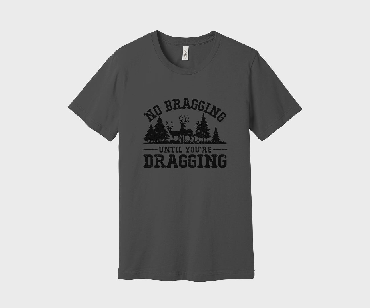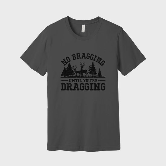 Show your hunting pride with this Bella + Canva 3001 shirt, boldly stating "No Bragging Until You're Dragging" alongside a detailed image of a deer. This shirt is perfect for hunters who know the real work begins after the shot.