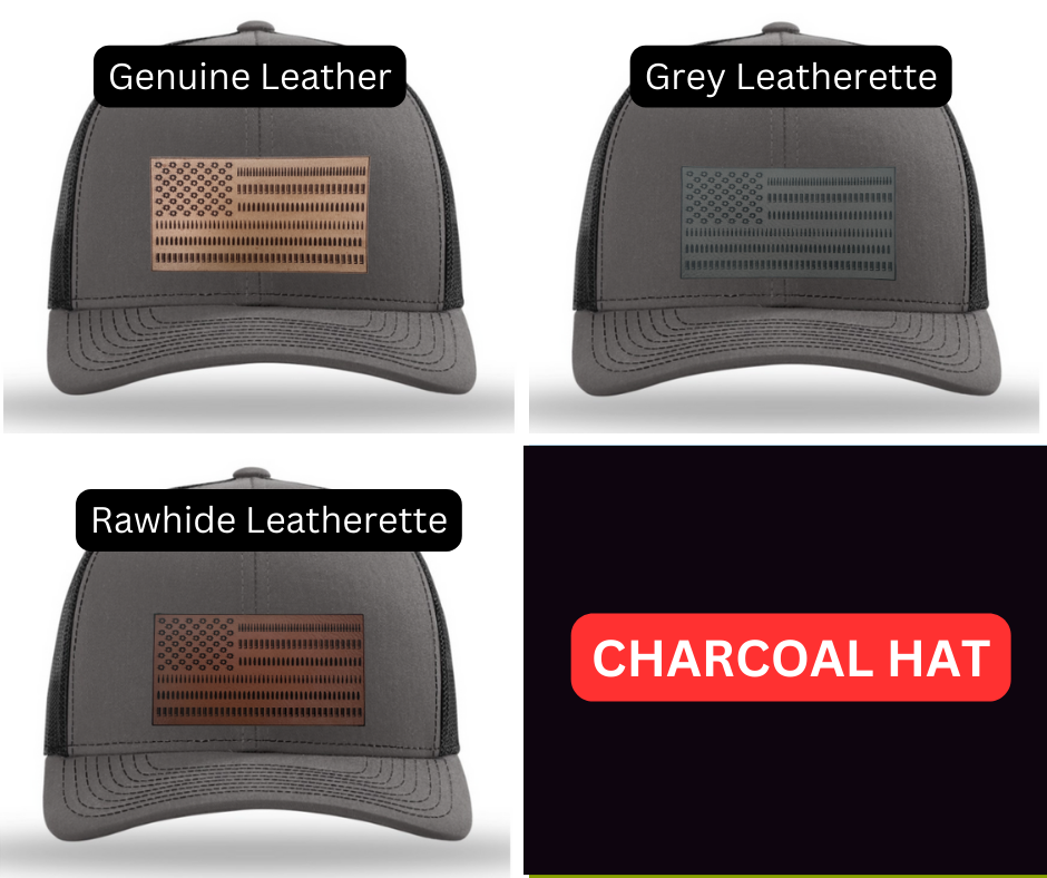 Crafted with precision and comfort in mind, the Richardson 112 Snapback offers an adjustable fit, while the FlexFit L/XL provides a snug and flexible feel. The defining feature of this hat is its meticulously crafted patch, available in Genuine Leather, Rawhide Leatherette, Grey Leatherette, and Camo Leatherette. The American flag, formed by various ammunition sizes, serves as a unique and powerful symbol of patriotism and firearm appreciation.